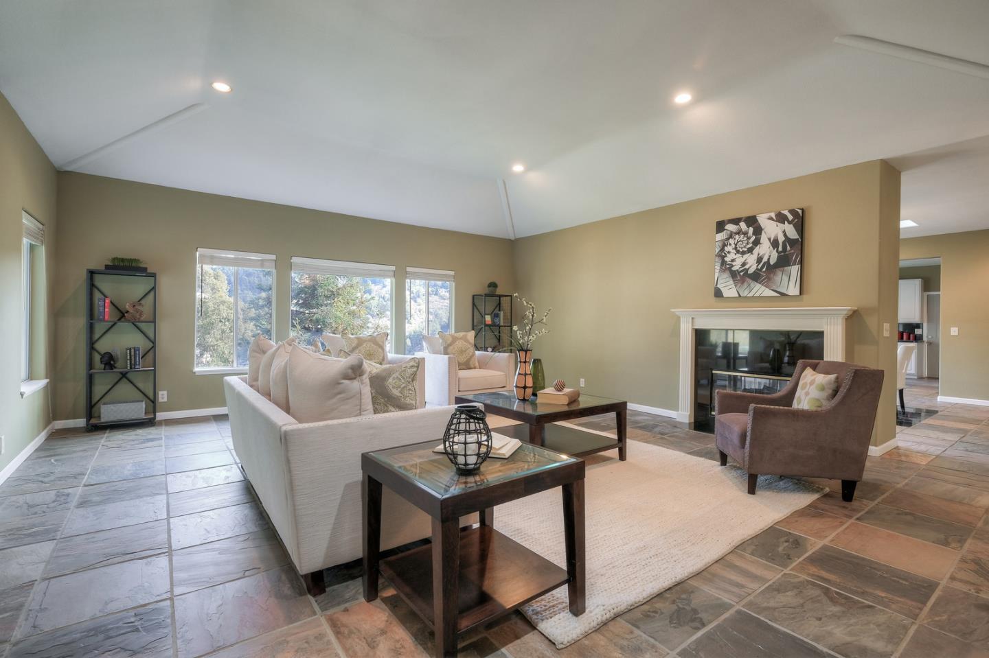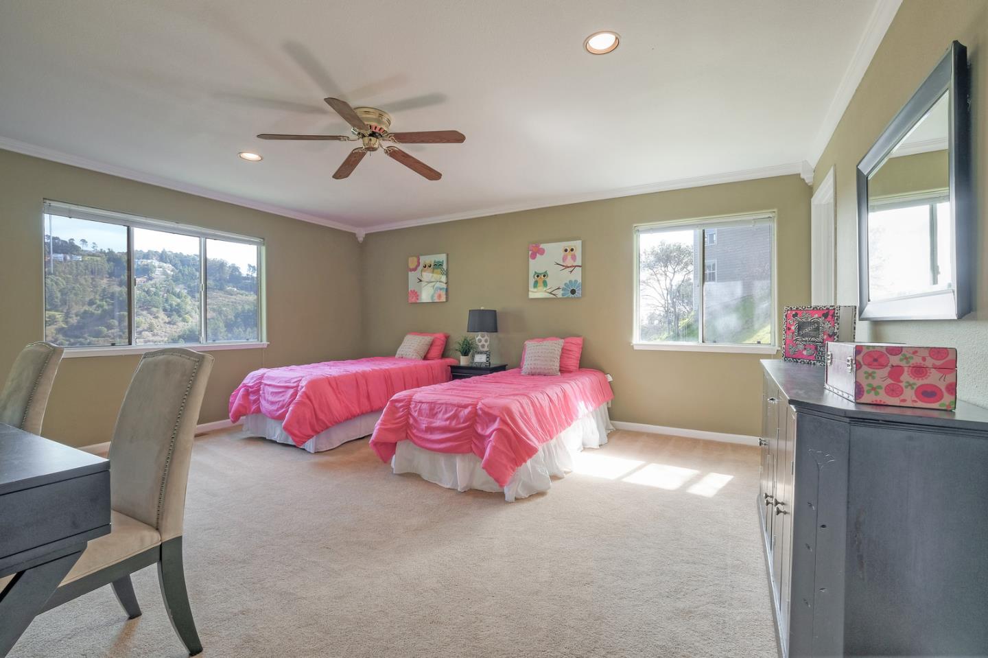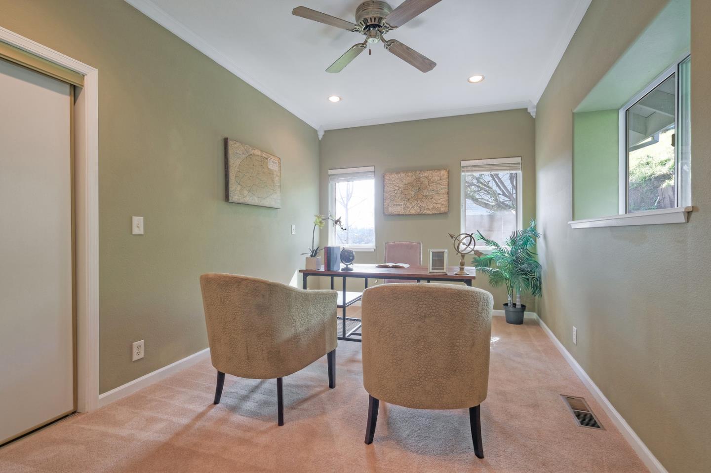 Spacious custom hillside home in desirable Claremont Hills with Panoramic views of the hills and open and airy layout. Huge high-ceiling great room and elegant formal dining room with beautiful double-sided fireplace, and sliding doors leading to the balcony, spacious gourmet kitchen with white cabinets and black counters, and a large pantry. Master bedroom on the other side with tons of natural lights generous en-suite bathroom and closet. The lower level leads to the family room, two spacious bedrooms with bathroom, and convenient laundry. Attached garage with interior access. Close in location just past Hiller Highland townhomes. Easy access to Rockridge/Elmwood shops & HWY 24. City of Oakland, Berkeley mailing only.