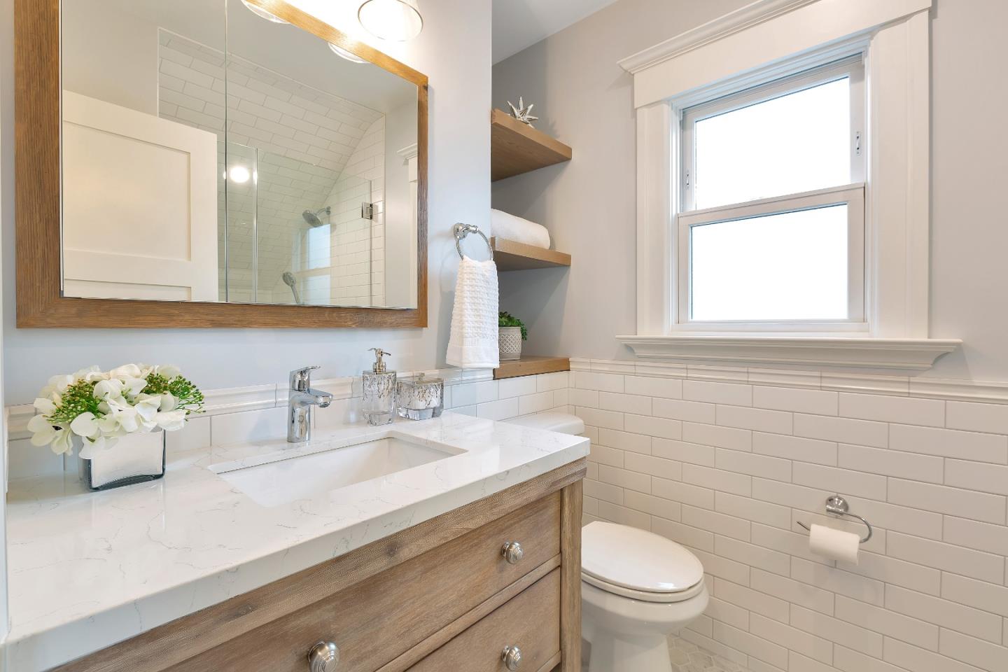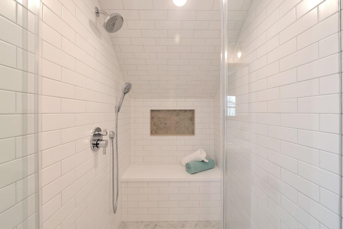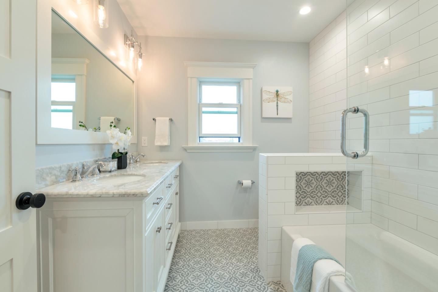 Double Sinks, Half on Ground Floor, Primary - Stall Shower(s), Shower over Tub - 1, Stone, Tile, Updated Bath |